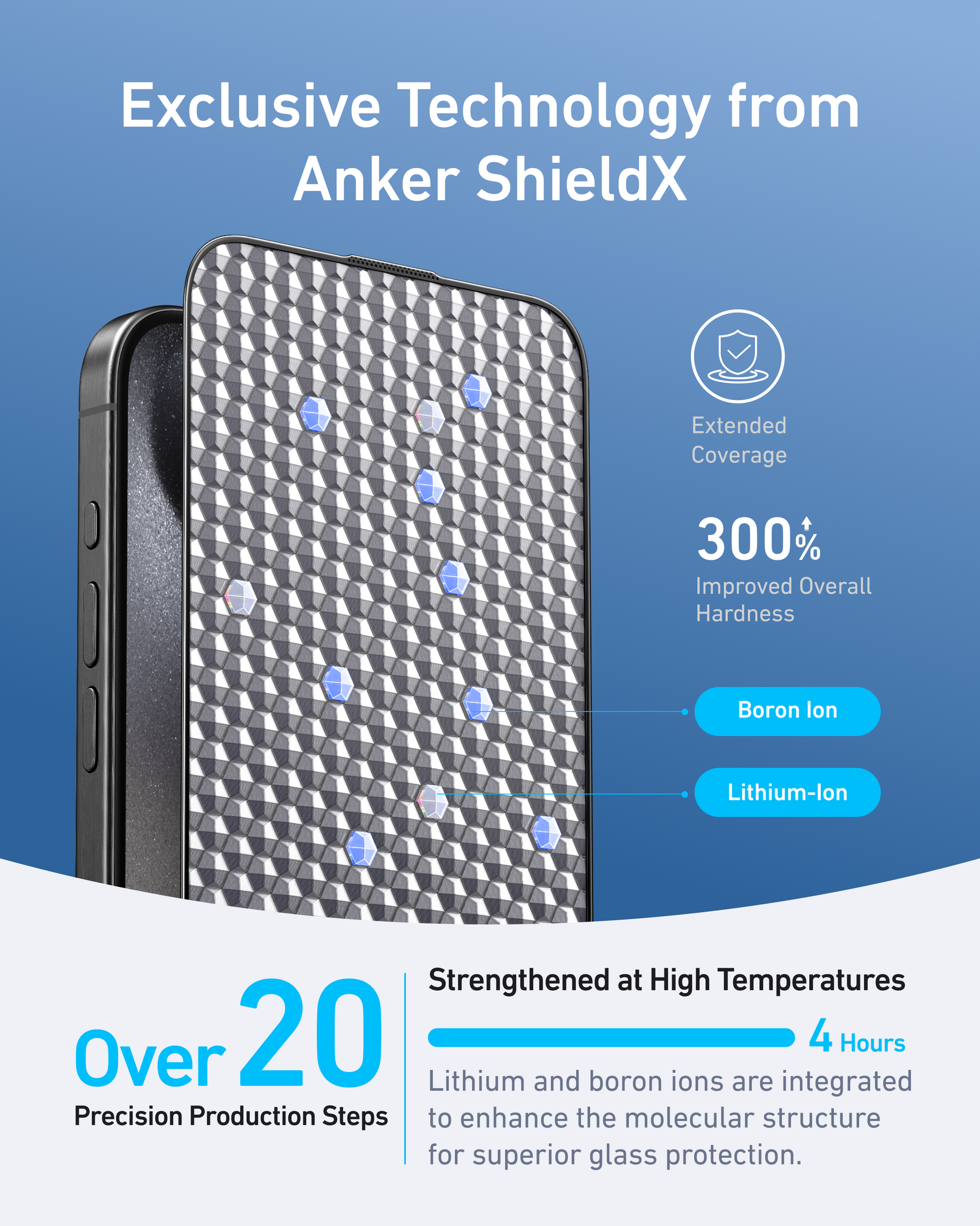 What You Get: Anker Easy Fit Screen Protector Kit (ShieldX Glass, HD, 2-Pack), welcome guide, extended warranty, and our friendly customer service.