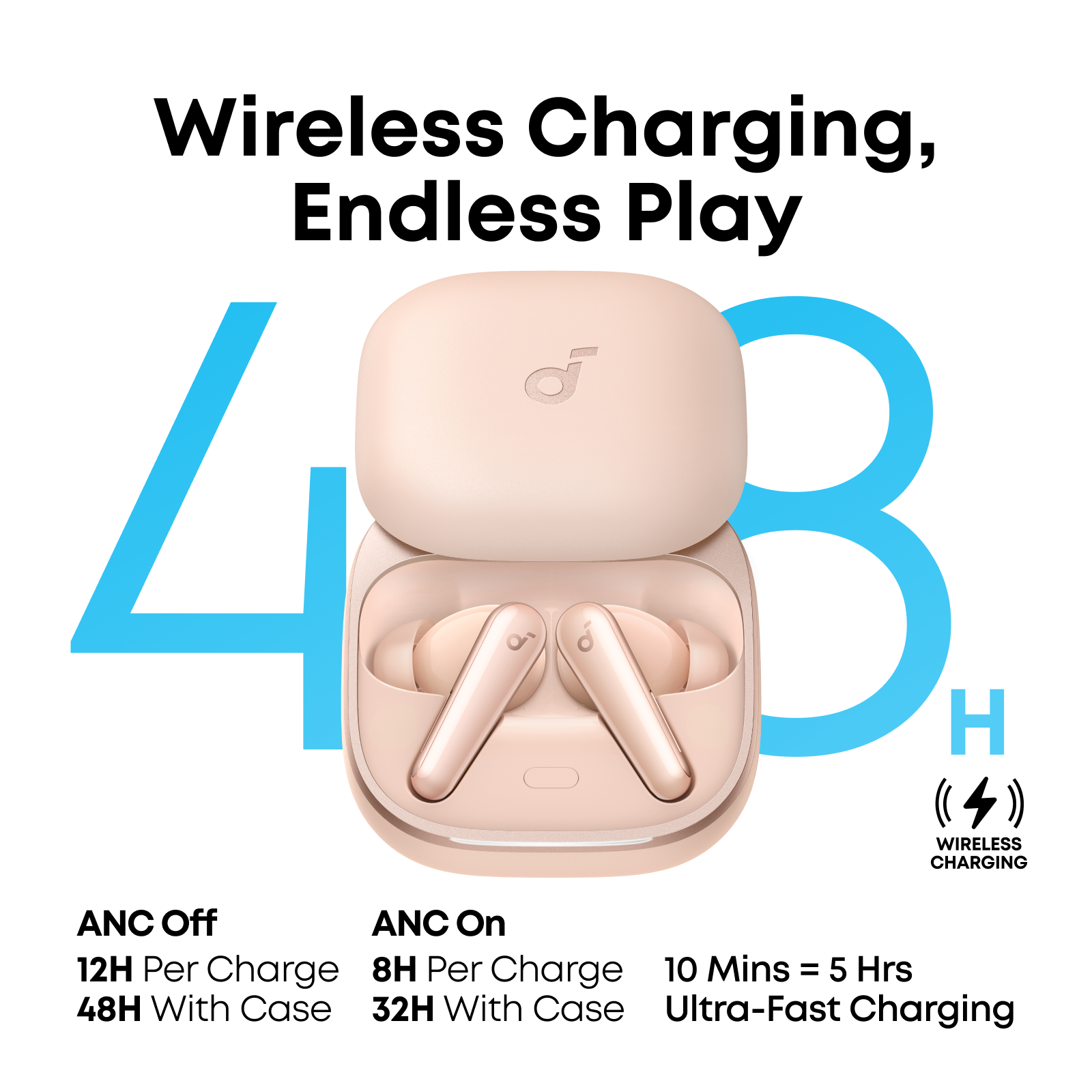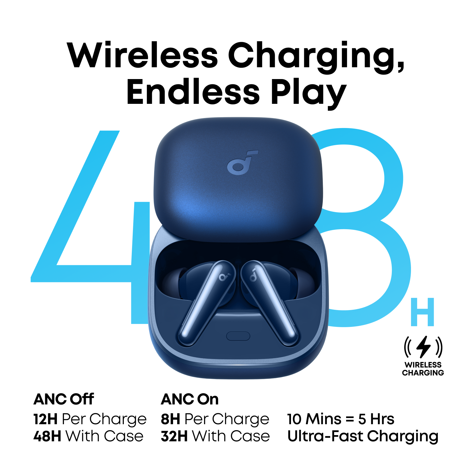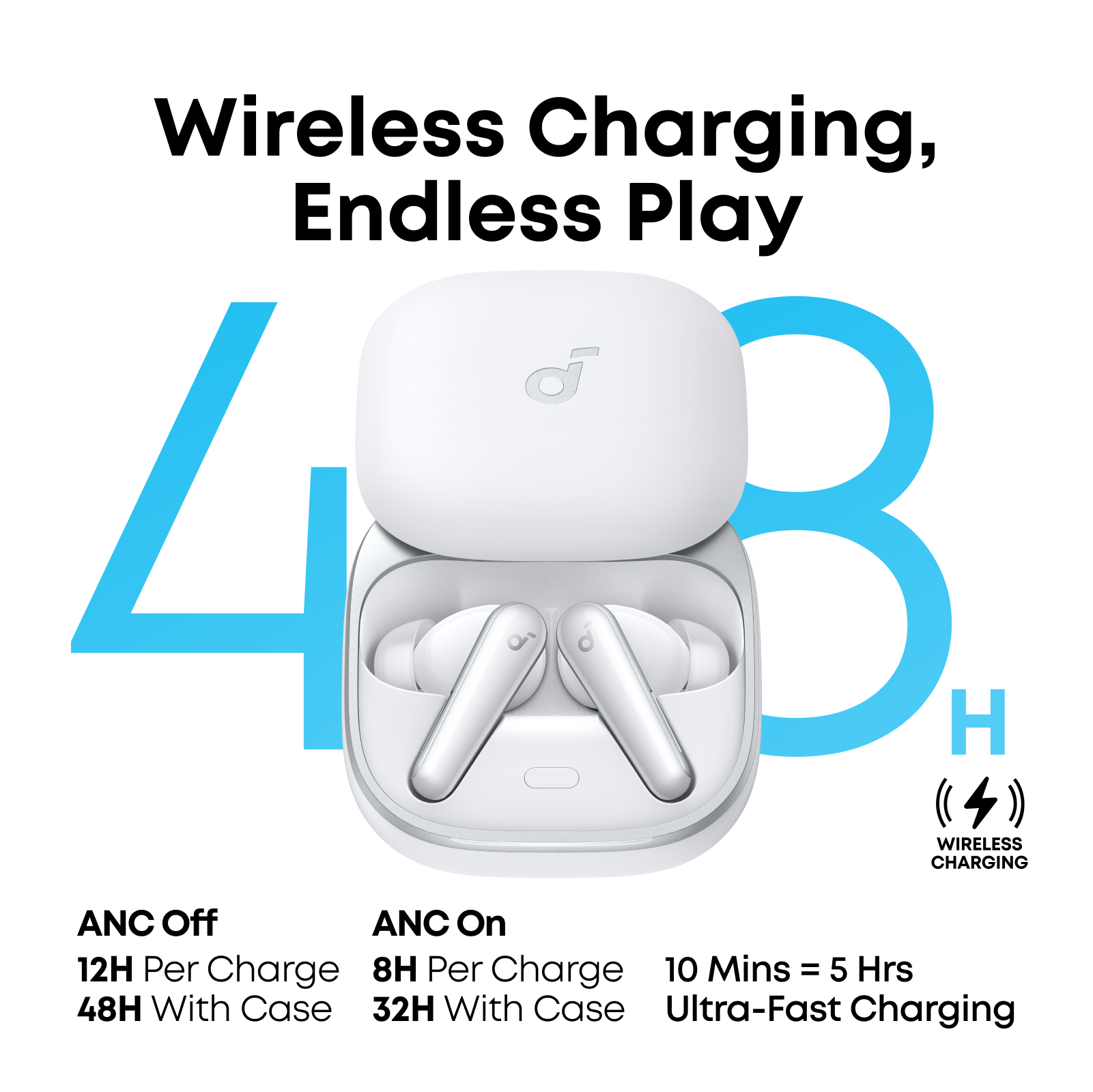 12H/48H ANC Off, 8H/32H ANC On: A 10-minute charge gives you another 5 hours.