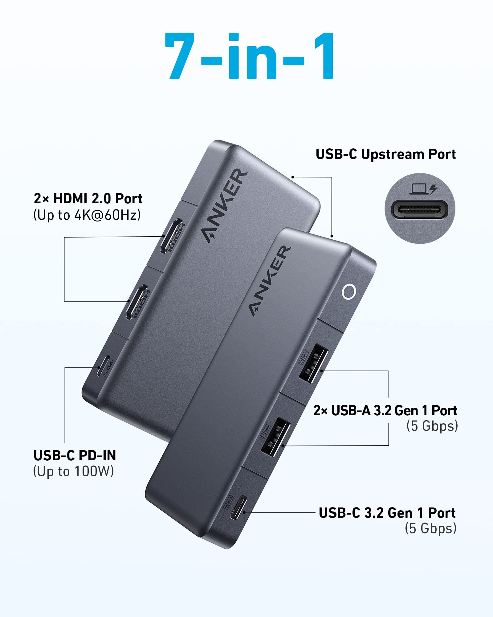 - 7-in-1 Connectivity: Equipped with two 4K HDMI ports, a 5 Gbps USB-C port, two 5 Gbps USB-A ports, a 100W PD-IN port, and a USB-C upstream port.