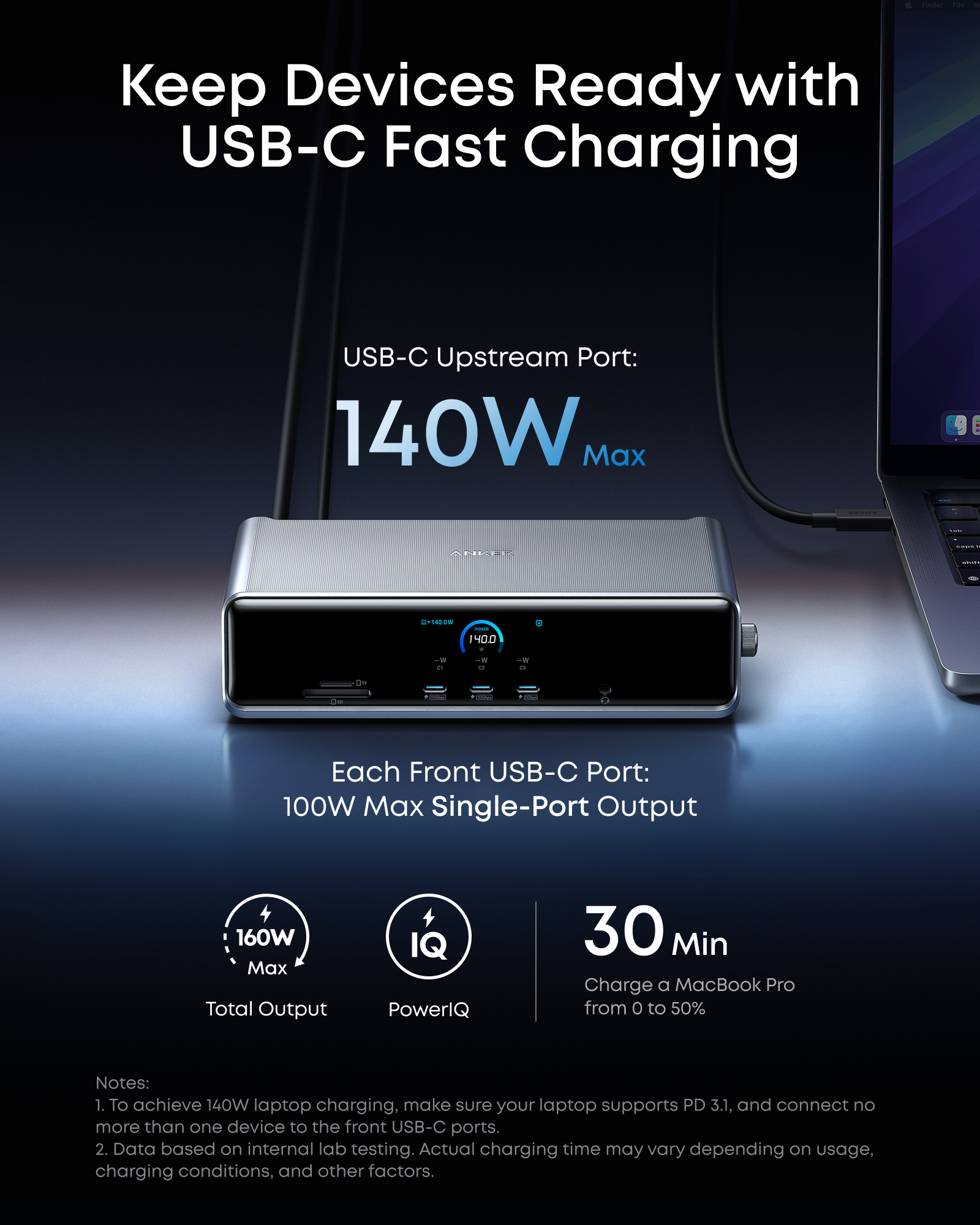 - Each Port Powers and Performs: Every USB-C port supports both charging and data transfer. Power your laptop with up to 140W via the upstream port, while each front USB-C port delivers 100W of high-speed charging. (Note: The front USB-C ports do not support media display.)