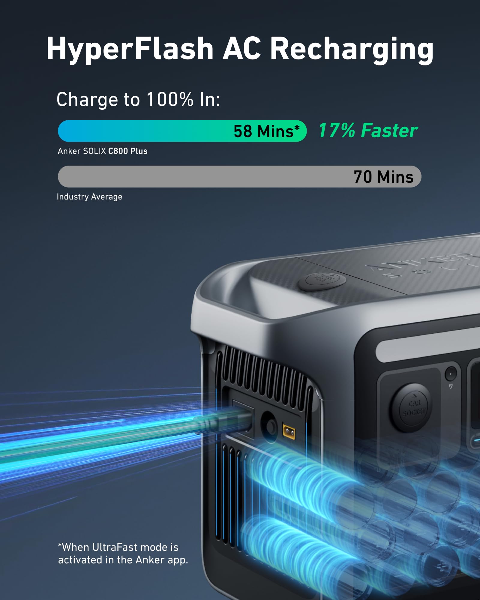 - Recharge in a Rush: When you need to hit the road, turn on UltraFast charging with the Anker app. Anker SOLIX C800 Plus recharges in just 58 minutes—17% faster than normal.