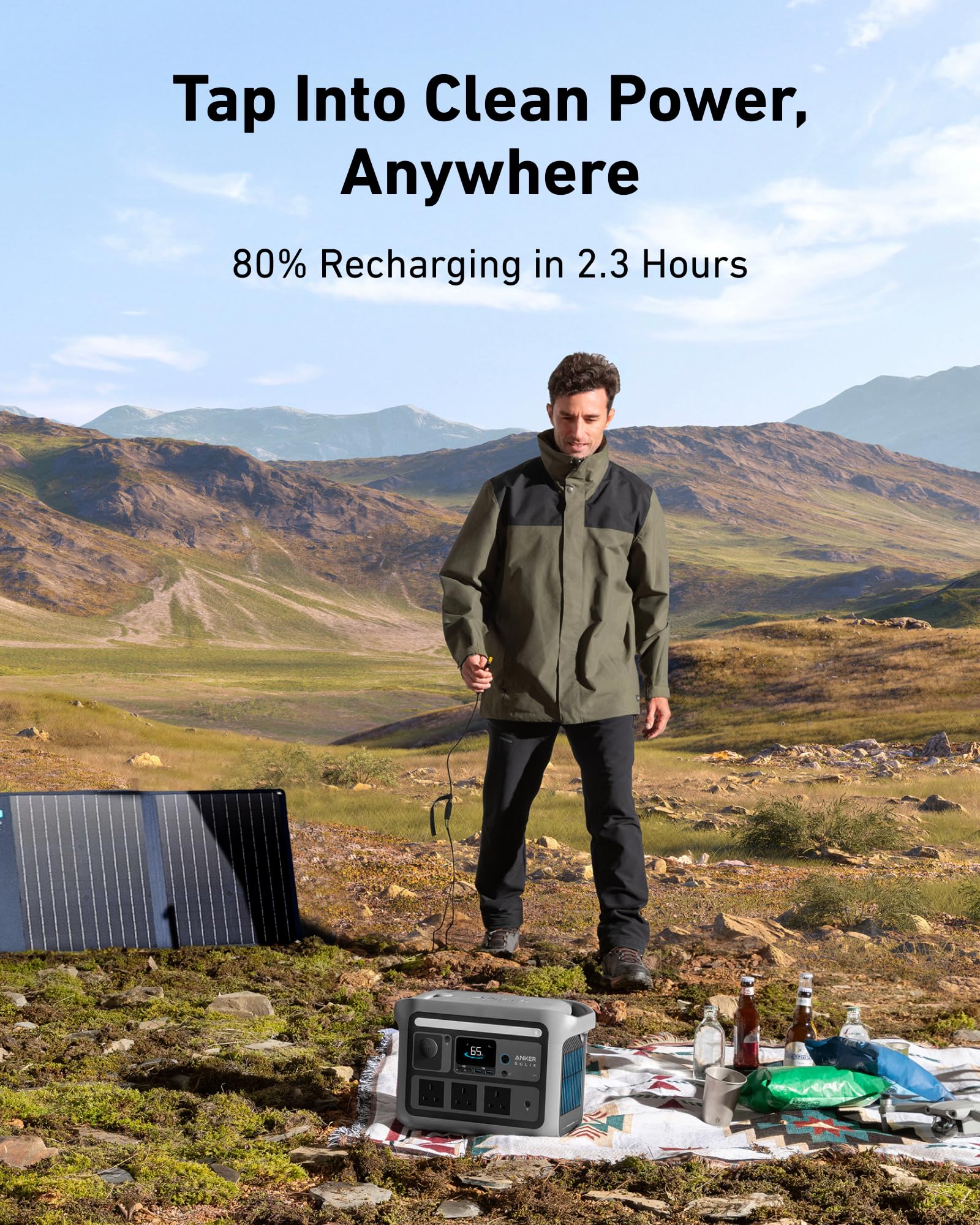 - Power Anywhere with Solar: Enjoy unlimited power, even if you're miles away from an outlet. Plug in a solar panel, up to 300W, and recharge to 80% in just 2.3 hours.