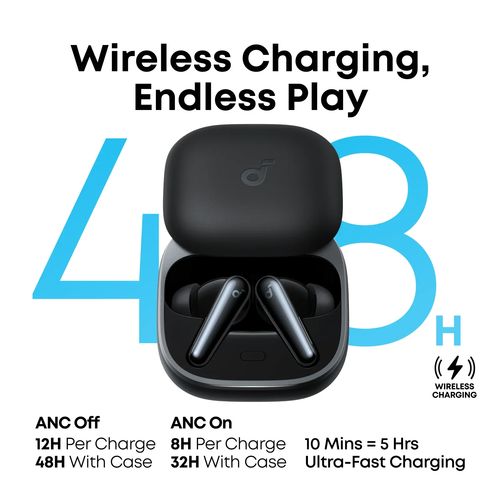 12H/48H ANC Off, 8H/32H ANC On: A 10-minute charge gives you another 5 hours.