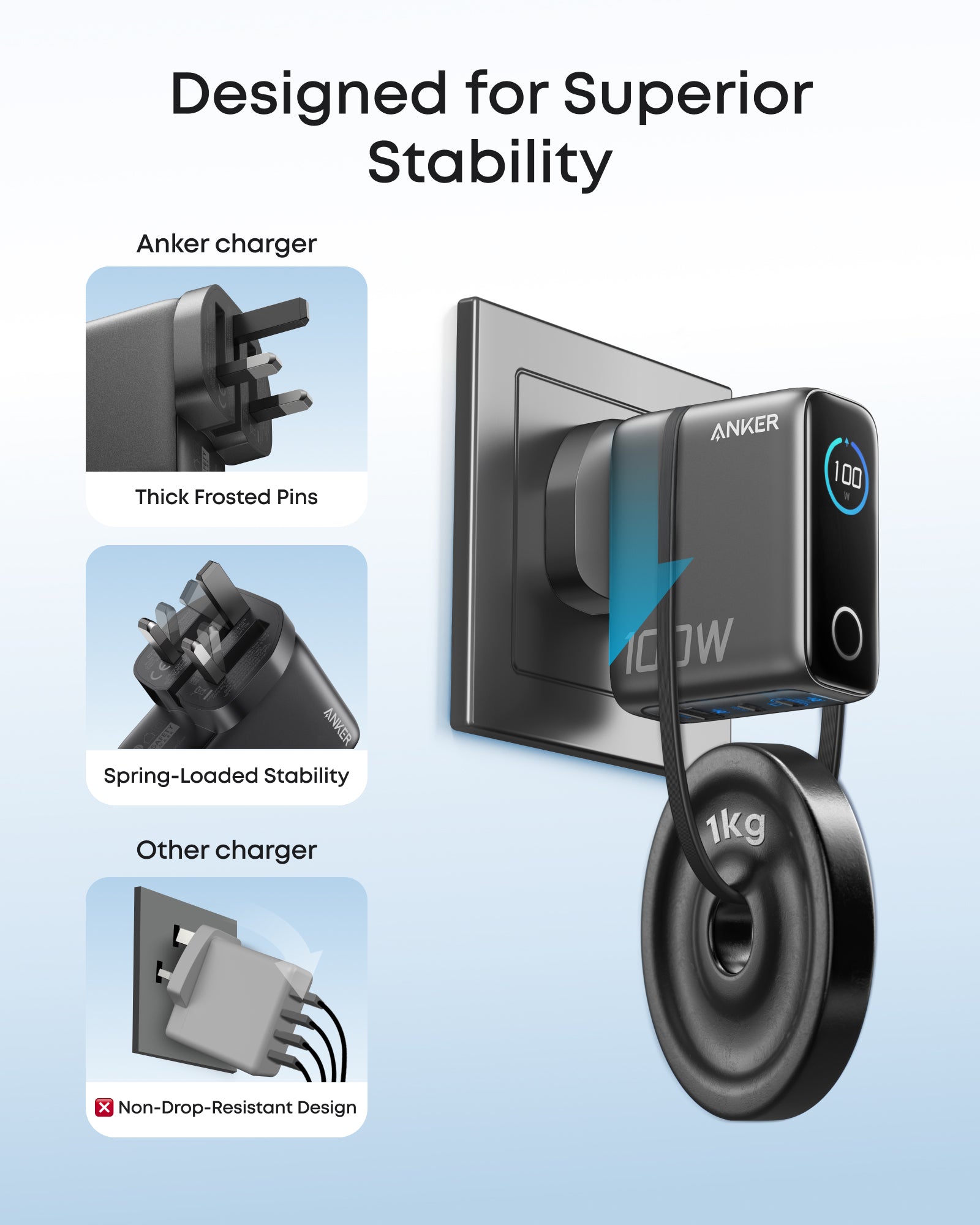 - Full-Speed 100W Max Power: Advanced GaN technology delivers a steady 100W output on any USB-C port and sustains peak performance up to twice as long compared to the average 100W charger.